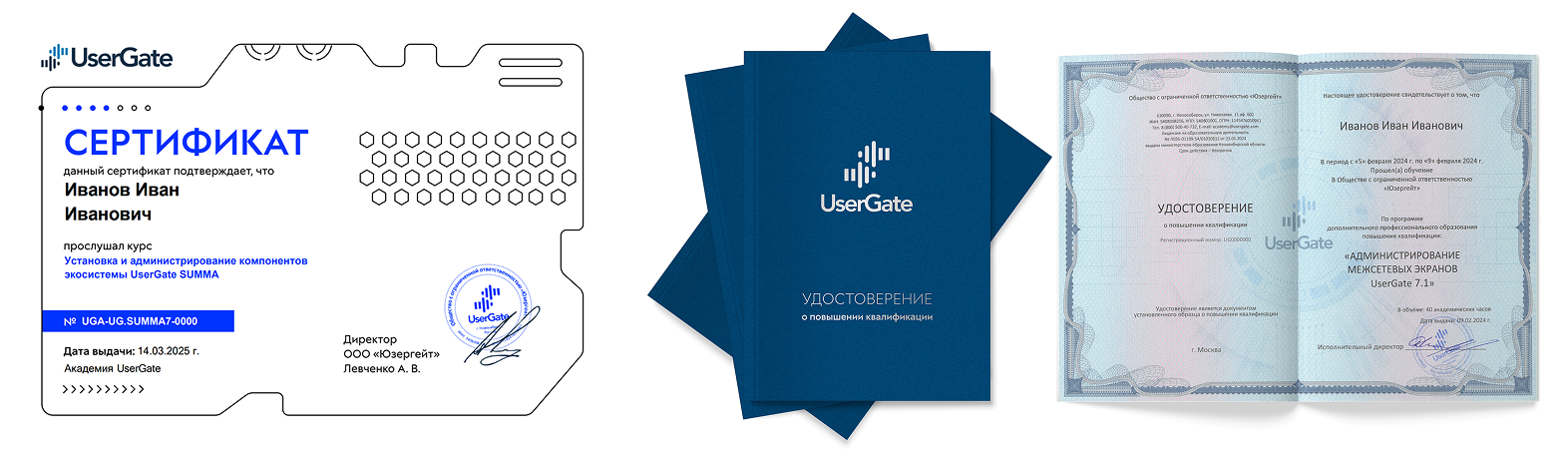 Слушателям, успешно освоившим соответствующую программу обучения и успешно прошедшим итоговую аттестацию, выдается удостоверение о повышении квалификации установленного образца и сертификат Академии UserGate о прослушивании авторизованного курса. Удостоверение о повышении квалификации выдается слушателям, успешно завершившим программу курса, при наличии действующего договора на образовательные услуги.